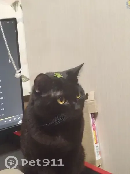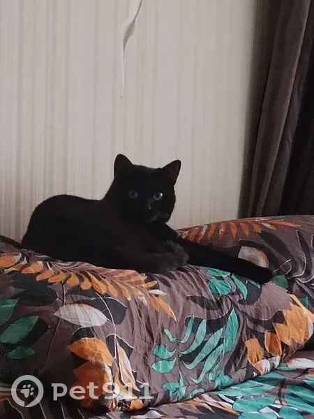 Черный кот, с белым маленьким пятнышком на ключицах. Возраст около 4 лет.Очень пугливый, при контакте с незнакомыми людьми будет убегать. Вес около 4 кг, высокий. Над глазом небольшой шрам похожий на бровь.