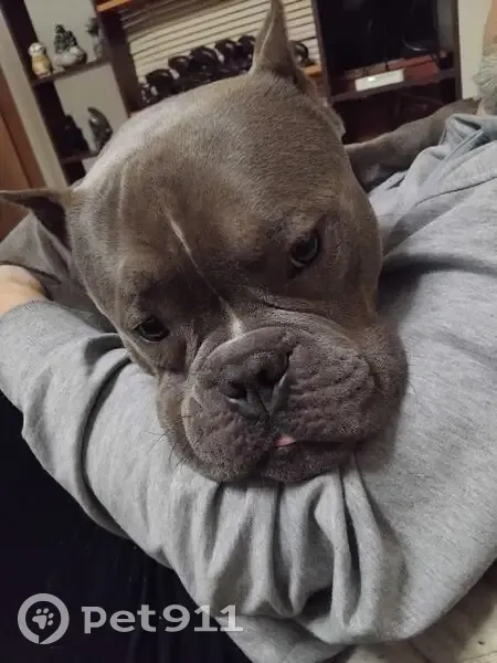 серый булли с белой грудкой с широким тканевым ошейником с коричневой кожаной ручкой. Неправильный прикус, нижняя челюсть выдвинута, иногда торчат зубы и язык.