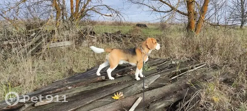 Бигль, 2,5 года, рост около 40 см, вес 15 кг. Окрас трехцветный, основной - рыжий; нос, лапы, живот и половина хвоста - белые, на спине - черный. Уши висячие. На шее был адресник на оранжевом шнурке и бордовый ошейник. Перепрыгнул через забор на сугроб и ушел по дороге в сторону села Кривское.