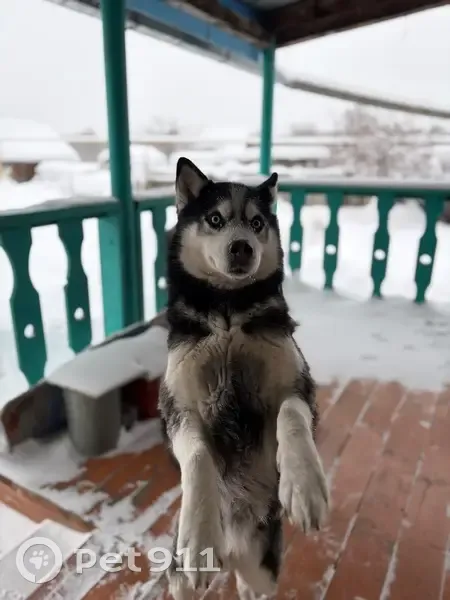 Порода: Сибириский хаски. Черно-белый окрас, глаза голубые. Перепрыгнула через забор дома и убежала.