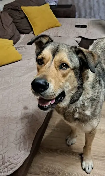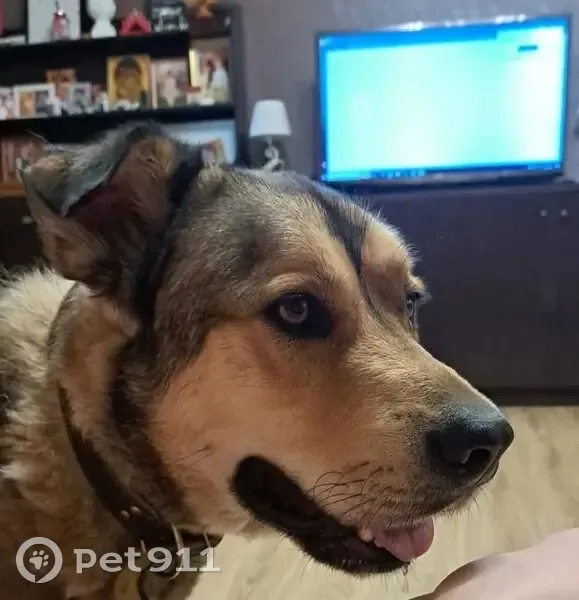 Тамир 4 года.Испугался взрыва, выскочил через забор 23.02.26.Окрас волчий, крупный, стройный.Пес пугливый, не агрессивный, к чужим не подойдет. С кожаным ошейником внутри желтый флис.