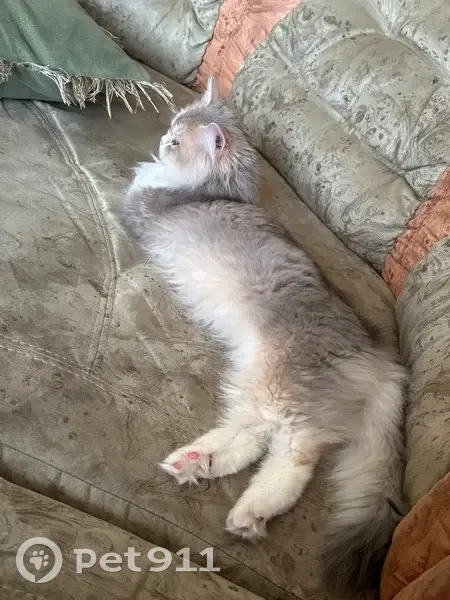 Окрас трехцветные. Очень пугливый, убежал с поводком на прогулку на участке. На кличку не отзывается. Голосок очень тихий