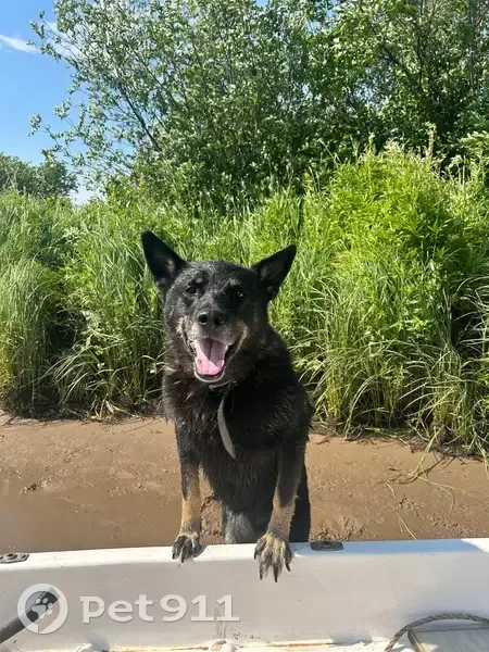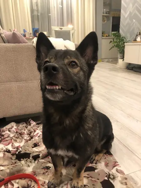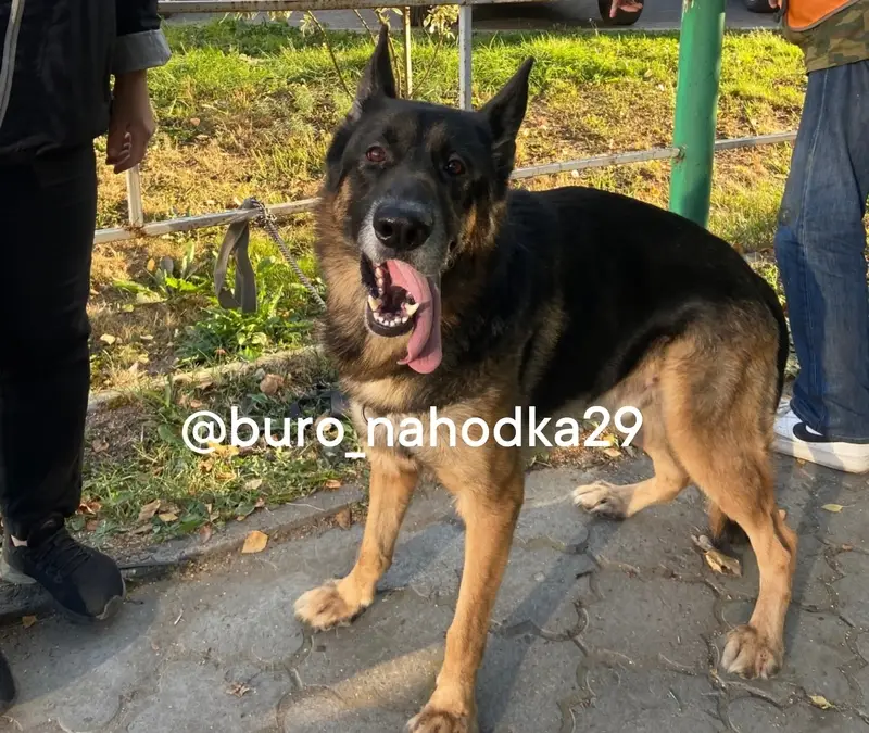 Черная овчарка , немного с коричневым . Спокойная, стерилизованная . Без ошейника .