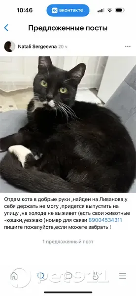 Черно белый кот ,тактильный к детям ,неагрессивный . Кот уже давно бродит по Ливанова ,найдись старый хозяин или новый .
