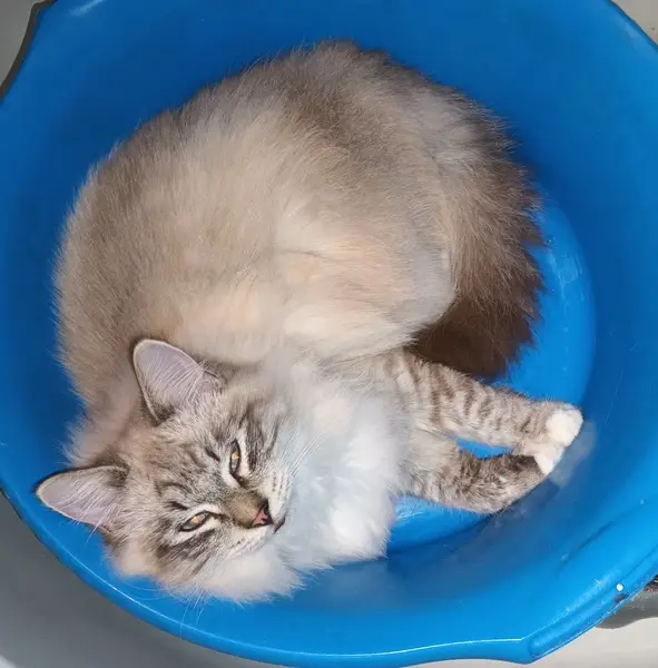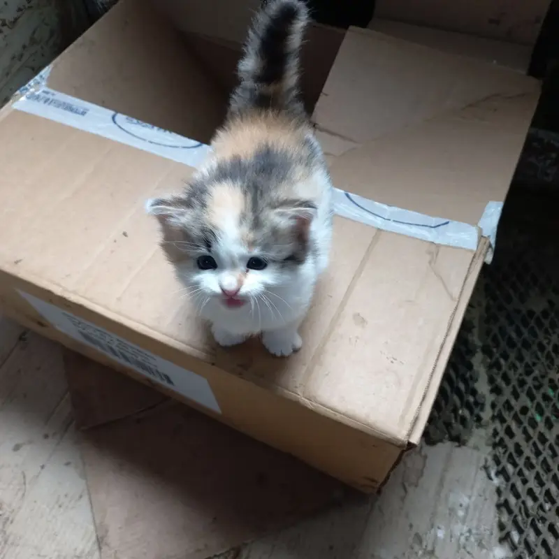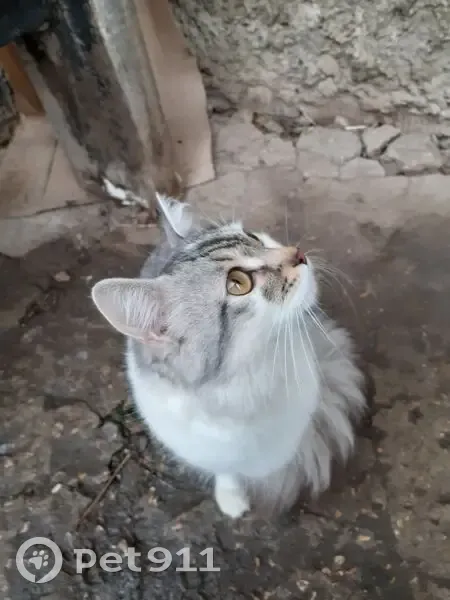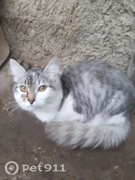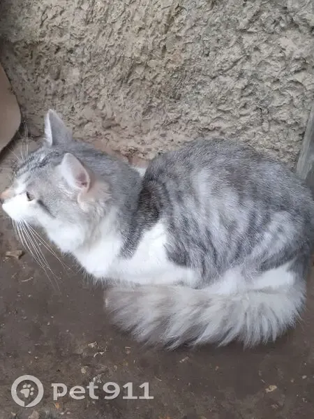 Пушистая, цвет пепельно-белый, добрая, ласковая, немного напугана, хочет домой. Приблудилась живет в подьезде, забрать себе не можем, так как у нас кот кошка и пятеро котят, подкармливаем.