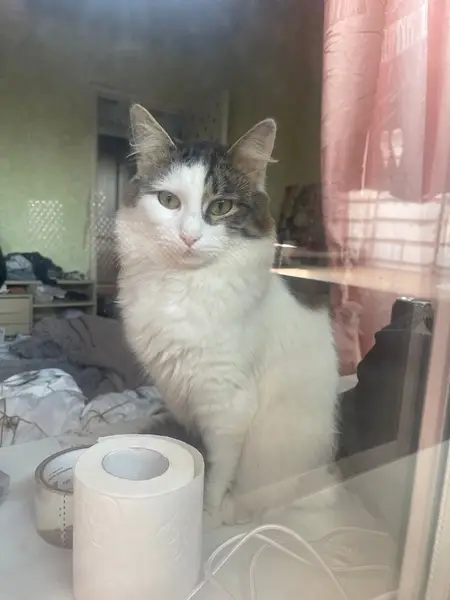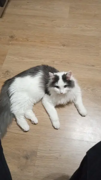 Окрас белый с черными пятнами. Глаза голубые. Очень ласковый. К туалету приучен. 8-906-715-93-32 Лена.