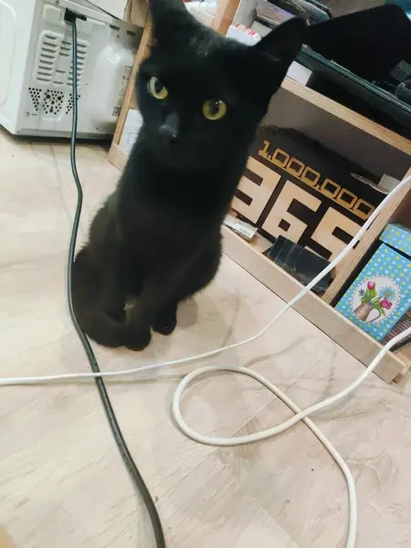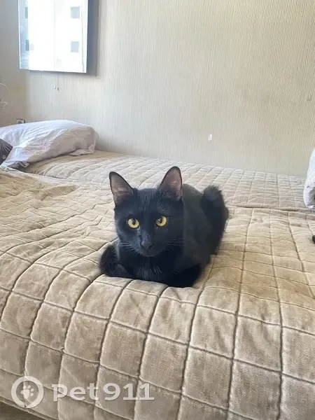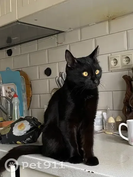 Черная, худая кошка, яркие желтые глаза, на груди есть совсем небольшое белое пятнышко. Очень пугливая. Ночью спрыгнула с окна на козырек подъезда, как только выбежали искать след простыл.