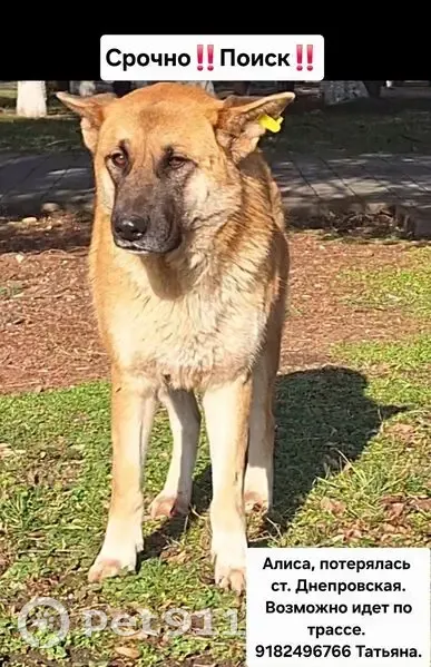 Пропала огромная, ярко рыжая собака. Алиса. Возраст больше 2х лет. Жёлтая бирка в ухе. Я ее пристроила в семью. Привезла из Тимашевска в ст.Днепровская.Ушла загадочным образом из семьи. Нет следов. Возможно идет по трассе в г. Тимашевск, возможно сбилась с пути, возможно вывезли. Срочно! Поиск по всей Кубани! 9182496766 Татьяна.