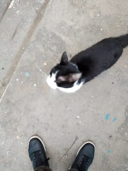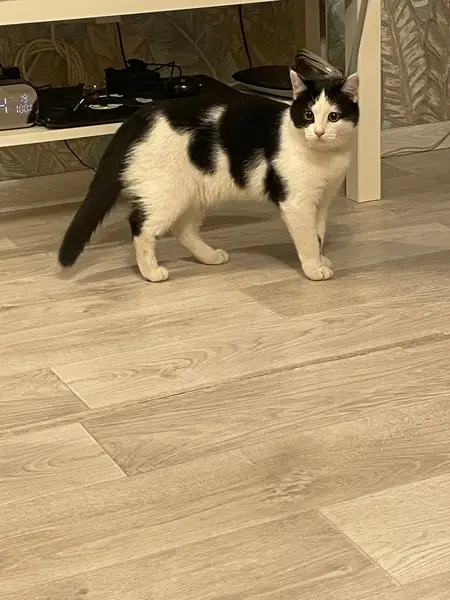 Мася не очень большая, с правой стороны у неё чёрная губа, глаза жёлто коричневые, на боках ближе к попе два симметричных чёрных пятна, на ней розовый ошейник с адресником в виде кольцп
