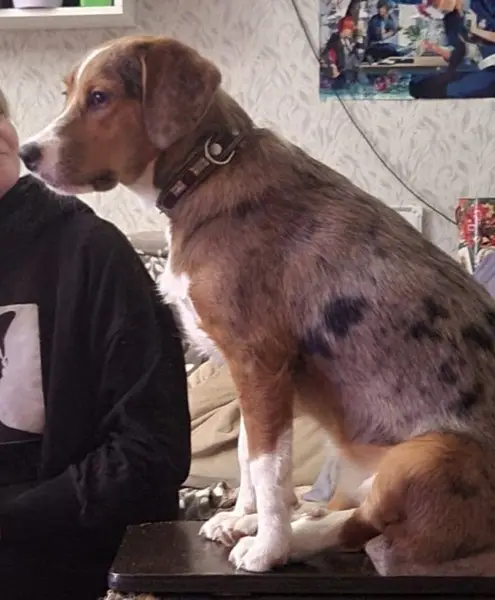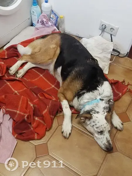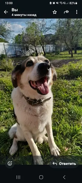 Метис овчарки, большая, упитаная, с белой головой и лапами в маленьких пятнышках.