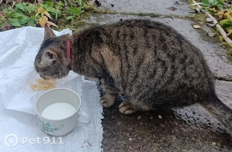 Найден котик в розовом ошейнике. На территории СНТ Лада. Пол не определили. Окрас полосатый, серо-рыжий. Миниатюрный, очень ласковый и всегда голодный. Около месяца бродит по участкам, но довольно чистый для уличного.