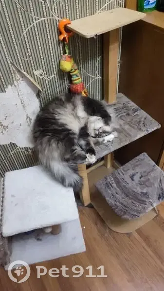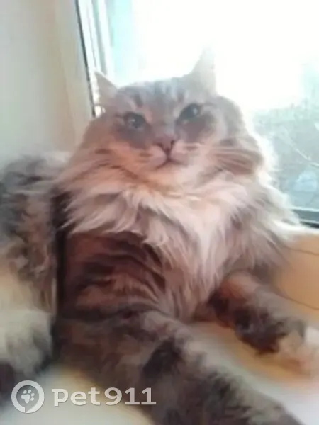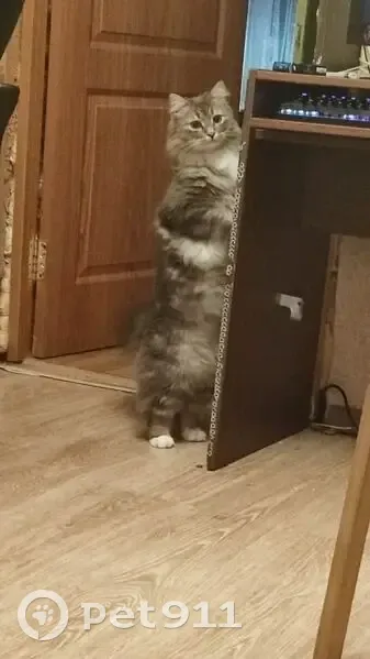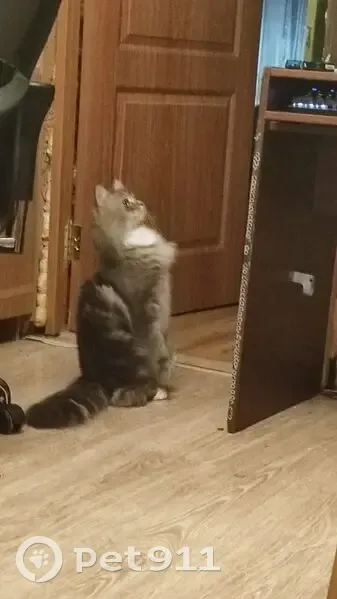 Дымчатый кот , белое пузо, не больших размеров, ко мне подбежала соседская собака он её испугался выпрыгнул из шлейки выпрыгнул из рук и побежал за кирпичный дом там я его уже не видел , возможно он залез в какую ту машину и она уехала ,мы ходили 2 дня и звали его он не откликался .