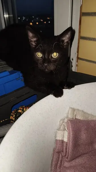 Черный кот по кличке Сёма. Два белых пятнышка на грудке и животике. Уходит гулять, но всегда приходит домой. 17 августа ушел гулять и больше его не видели.