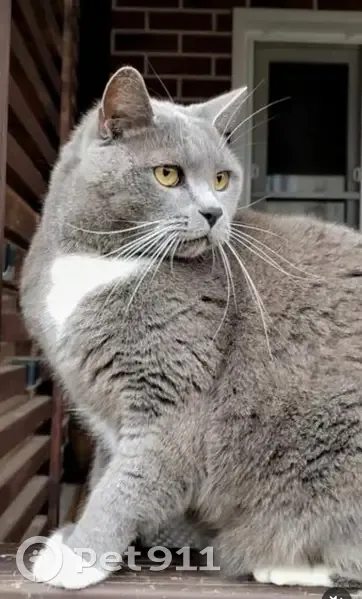 Окрас серо-белый, помесь с британцем. Белые кончики лап, белый воротник и белое пятно на животе, нос тёмно-серый, глаза жёлтые. Был в бежевом ошейнике.