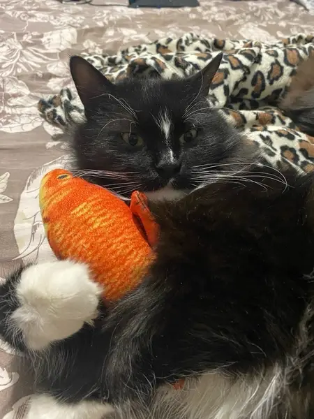Полный и пушистый кот с белыми усиками. Откликается на кличку Лунтик. Очень ласковый и добрый.