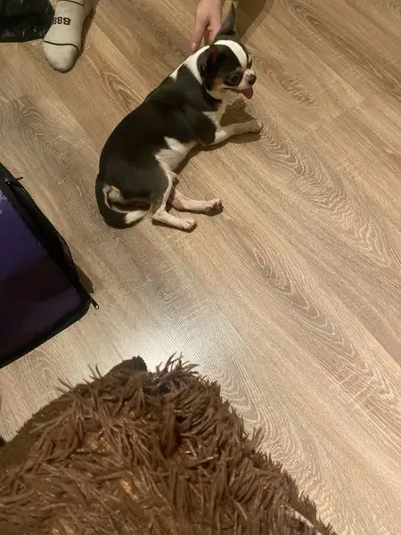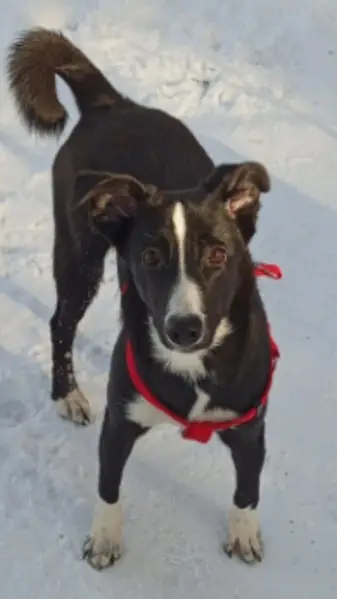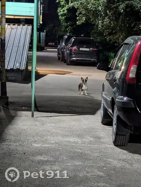 Собака темно рыжая с белыми пятнами (примерно килограмм 7). Беспокойная. Бегал вокруг домов без остановки. Забежал во дворы и остался там бегать. Поймать не смогли двумя семьями. Очень пугливый,в руки не даётся.