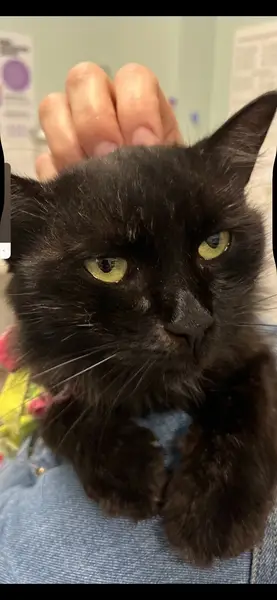Кошка черного цвета, девочка. Глаза жёлтого цвета, рост небольшой, шерсть длинная. На шее есть колтуны от старости. Выбежала в дверь на садовом участке.