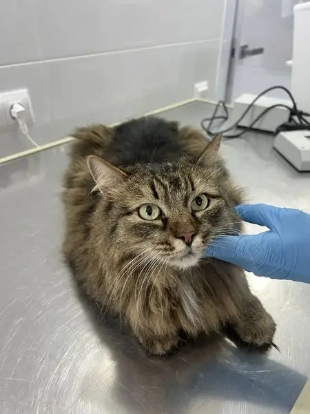Окрас лесной коричнево серый когти подстрижены крупный кот не агрессивный