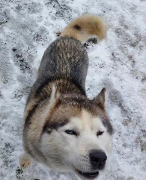 Окрас похож на хаски, один глаз голубой, другой карий. Бегает по двору, забегает в подъезды, магазины. Очень дружелюбный и ласковый