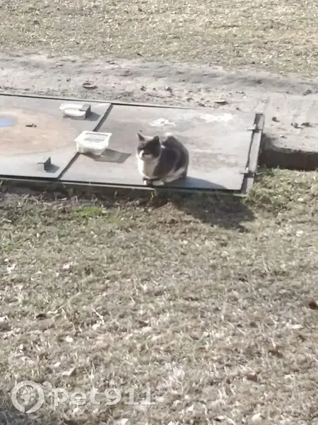Под окнами живет кот или кошка Серова с белым окрасам с ошейником от блох .