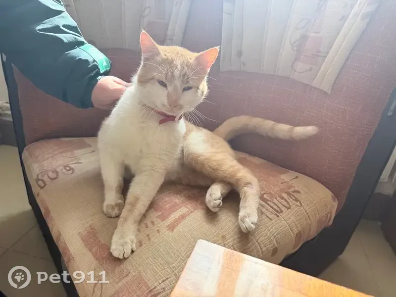 Приблудился кот бело-рыжего цвета, с виду молодой, ласковый, игривый с красным ошейником в общежитии Чограй на проспекте П. Анацкого,57/1, живет в фойе.
