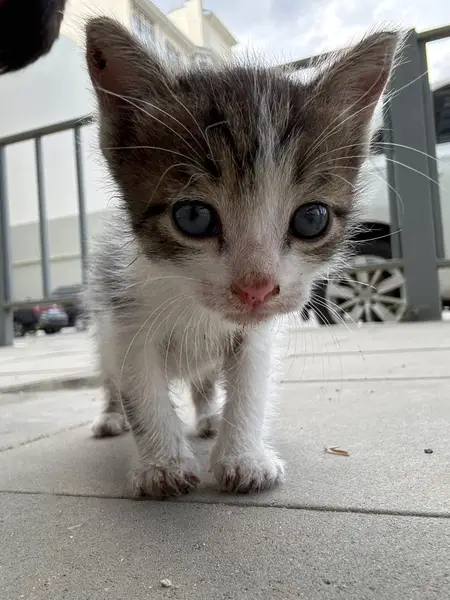 Ласковый котенок, бело-серый окрас, примерно 4 месяца, на кличку не отзывается