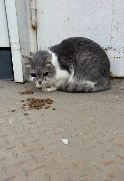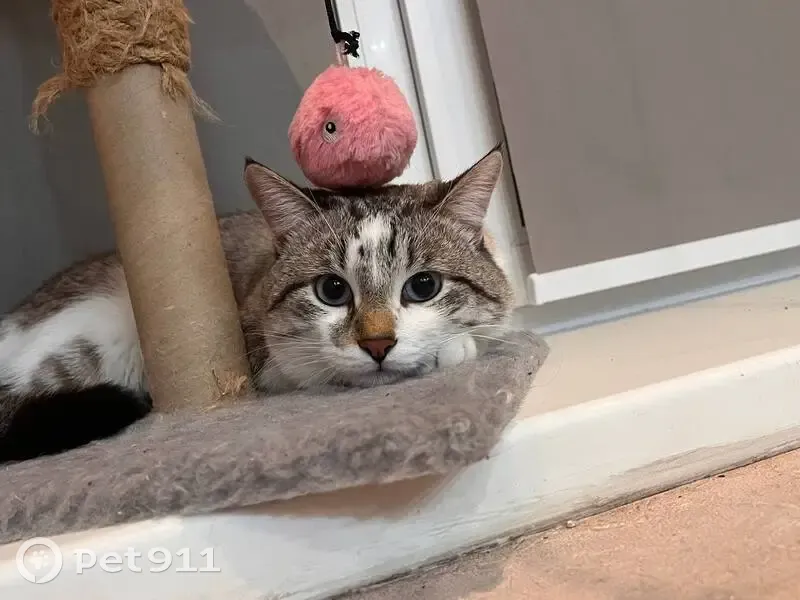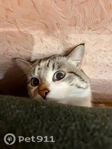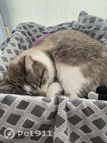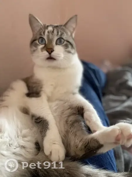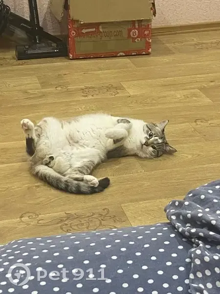 Отличительные черты: побрита попа после кострации, черный кончик хвостика, белое пузо, спинка серо-коричневого цвета, голубые глаза. Он очень пугливый на кличку может не отозваться.
