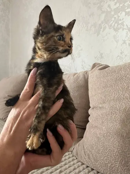 Очень маленькая кошечка, окрас разноцветный. Очень выразительные глаза и относительно длинные ушки. Упала с балкона. Из окна видели похожую на нее далеко во дворе, но так и не нашли. Очень ласковая.