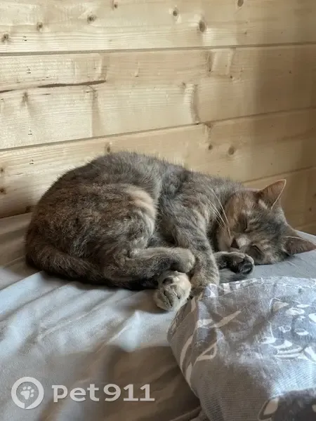 Окрас серый с коричневыми вкраплениями и полосками. На шее розовый адресник с кличкой и номерами телефонов. Ласковая, домашняя, привитая, но может быть пуглива, так как впервые оказалась в этих условиях.