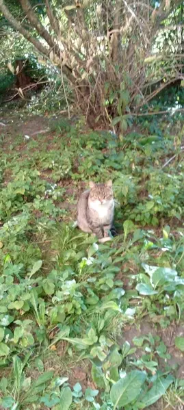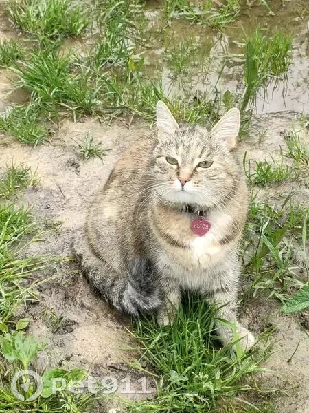 Окрас "шпротинка". Дворовая кошка. Коричнево-серая с чёрным. Жёлтые глазки, тихий голос. Носит ошейник и адресник в форме сердечка. Ей 10 лет. Небольшого размера. 28го после 22.00 ушла гулять по даче и не вернулась.