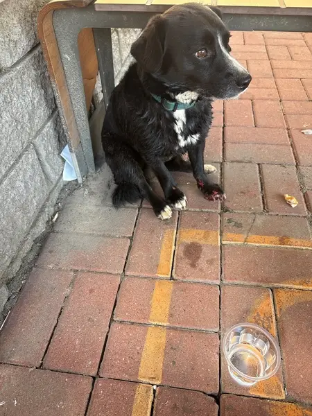 Маленькая собачка, дворняжка, Чёрненький с белым пузиком и белой лапкой.