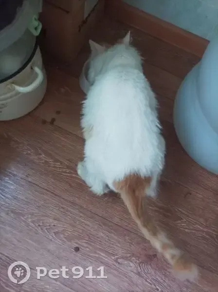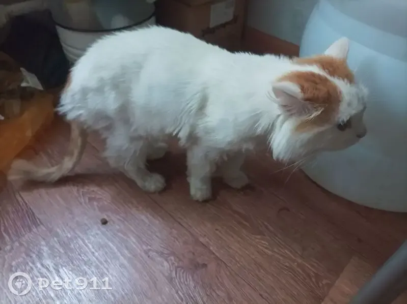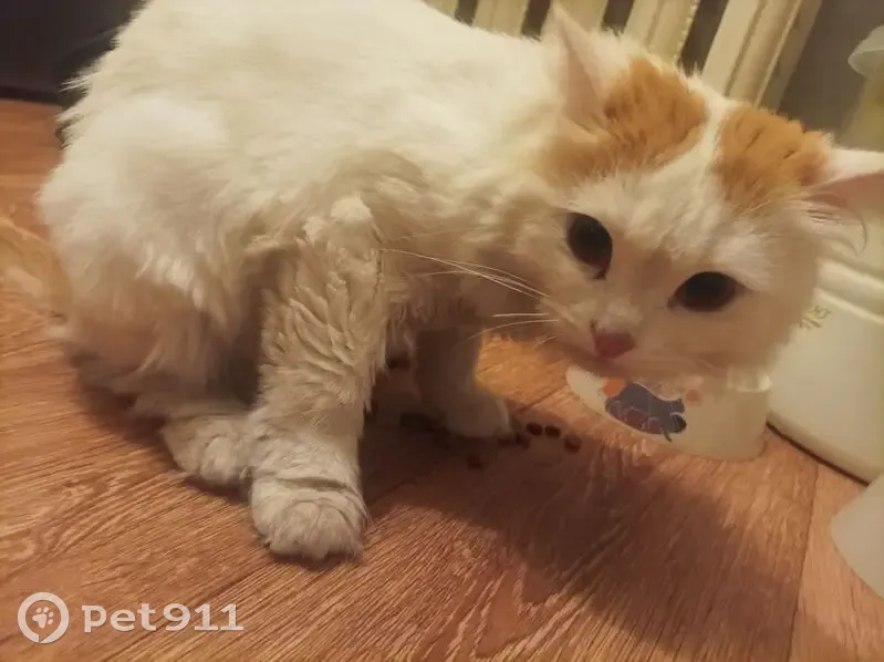 Белый или белая (пол не смотрели) с рыжими пятнами, пушистый. Когда-то был стрижен под льва. Очень пугливый и постоянно мычит,злится на других котов. С людьми- покладист