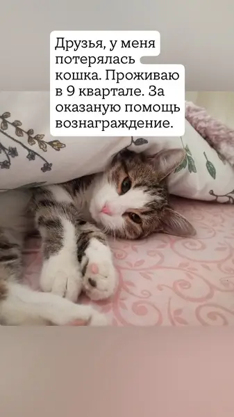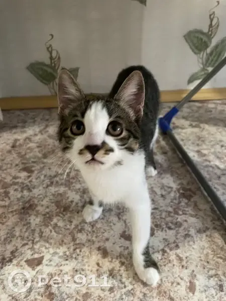 Окрас бело-серый, возраст около 4-5 мес., котенок очень ласковый, игривый, нашли около подъезда, чистенький, блох нет, к когтеточке и лотку приучен, во время игры даже когти не выпускает.