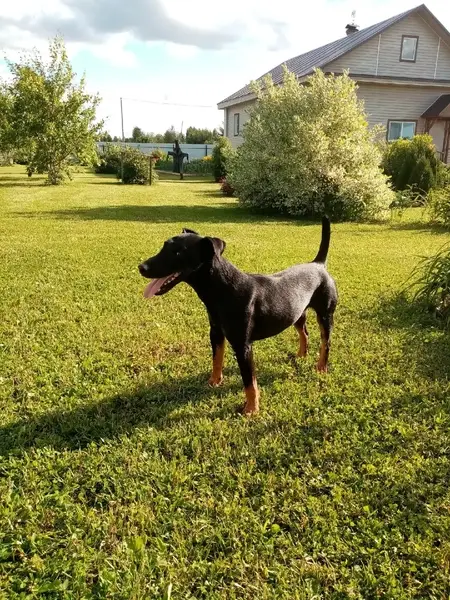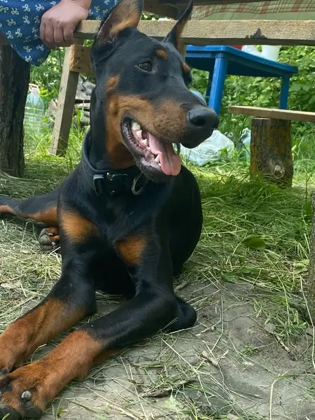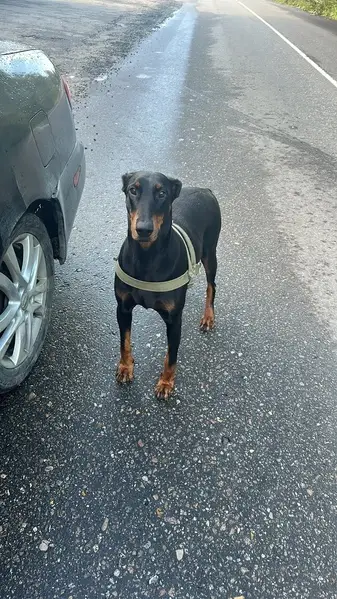 Доберман коричневый. Нашли волонтеры у дома рядом с лесом, бегал один, никого не было. Предположительно выбежал из леса. Примерно 9-10 месяцев.