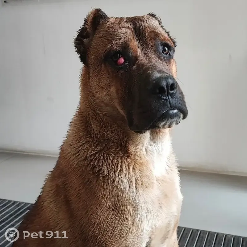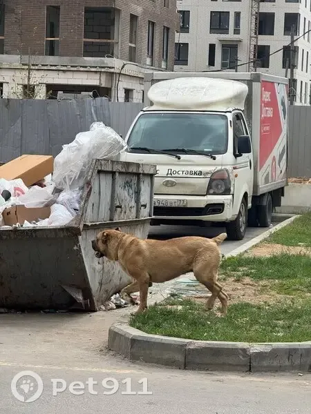 Рыжий/песочный кобель, похож на метис кане-корсо или алабая, на правом глазу воспаление, хвост и уши купированы, был в ошейнике, потом ошейник пропал,без агрессии тянется к людям, искал еду по помойкам в Жк Горки Парк