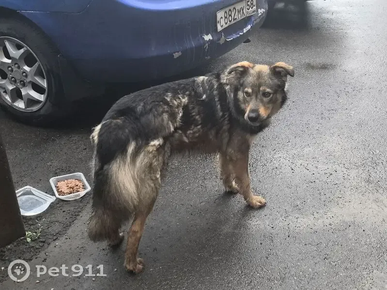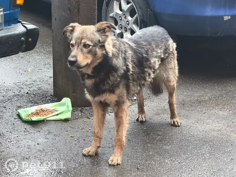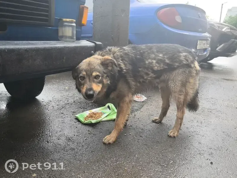 Собака размером с некрупную овчарку, глаза карие. На 8 марта 17 каждый день приходит и лежит. В ошейнике, но бирки в ухе нет. Спокойная, достаточно контактная, подходит есть и гладится