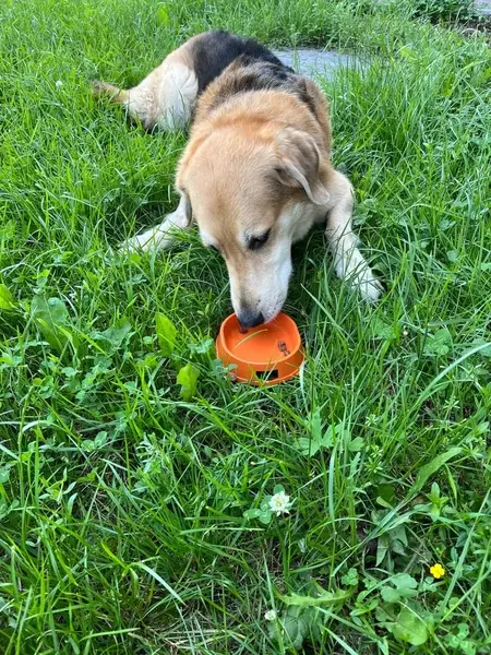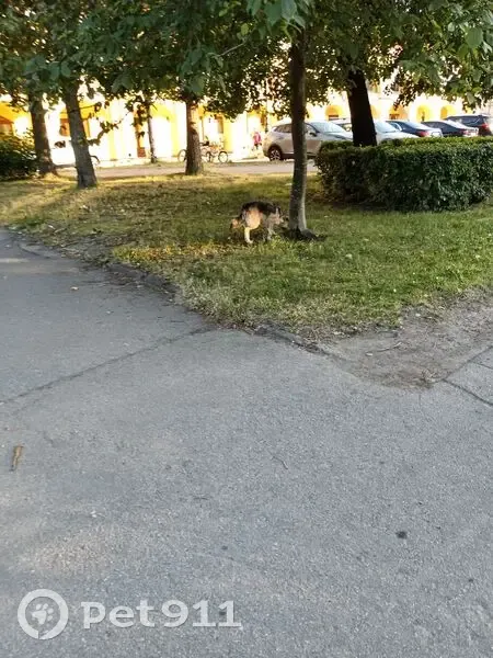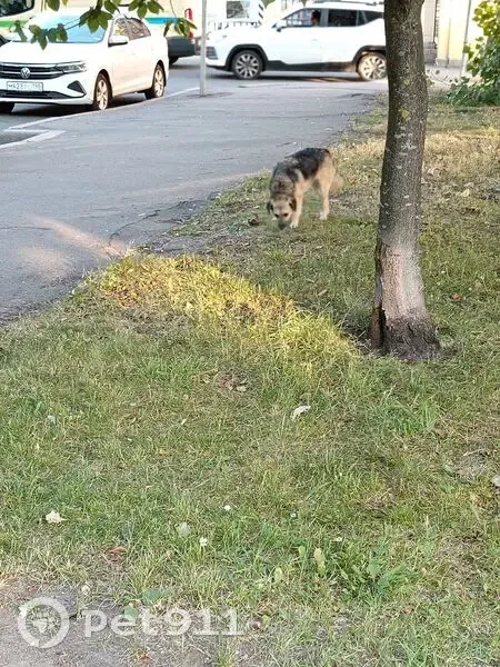 Собака среднего размера, коричнего чёрная, не агрессивная, безпородная. Я думал её выгуливают без поводка, а потом она перебежала дорогу, может быть бродячия.