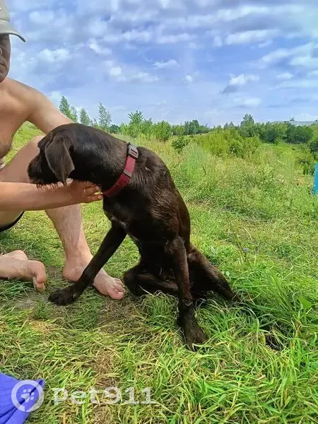 Окрас коричневый, курцхаар, ошейник красный, на загривке чуть ниже ошейника две заживающие раны. Прибежала на карьер около 10 утра, искупалась,знакомилась с окружающими. Уходили около 12, собака была еще там.