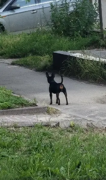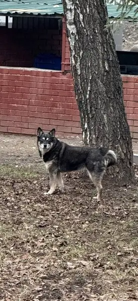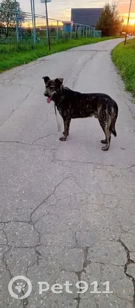 Наполовину черная, наполовину серо-коричневая, с ошейником и поводком