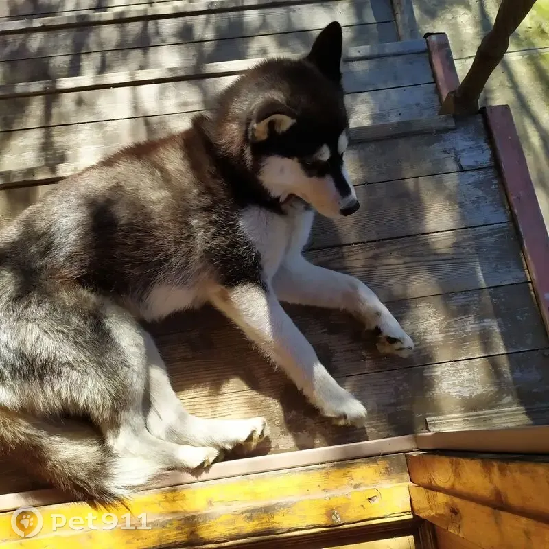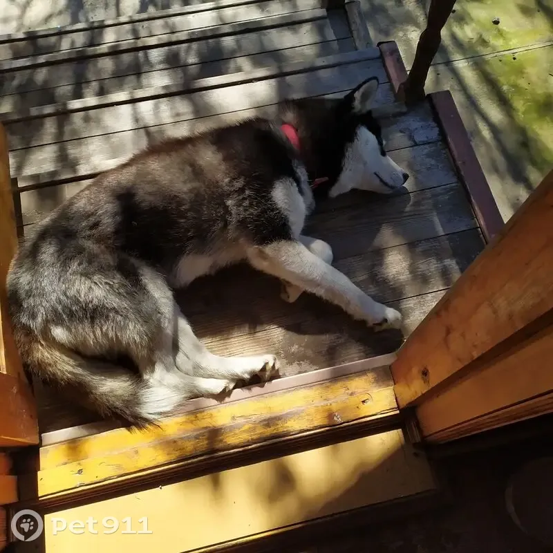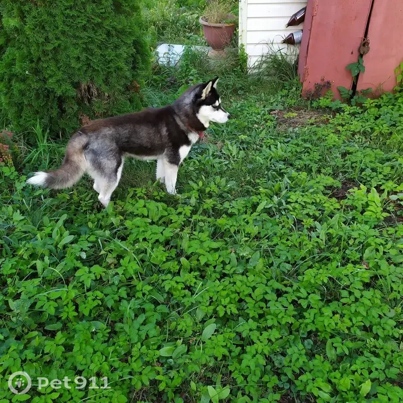 Хаски или метис хаски темного окраса. Глаза карие.Молодая сука. Пушистая, ухоженная,спокойная. Бежала около 21.15 по трассе М5 в потоке машин. Ошейник красный,поводок оборван. Легко дала себя поймать и усадить в авто.