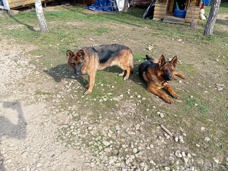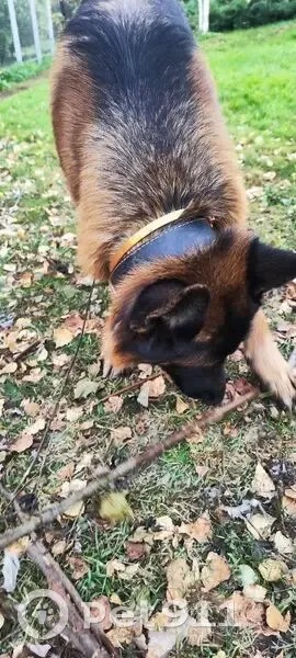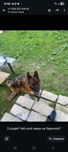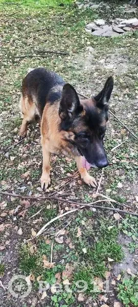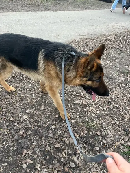Немецкий молодой кабель (как у многих овчарок проблемы с задними лапами), с двумя ошейниками, дружелюбный к людям(запрыгнул в машину). Бегал по дороге рядом с мусоркой из стороны в сторону, выглядел замотавшимся.