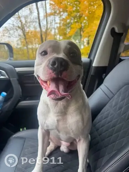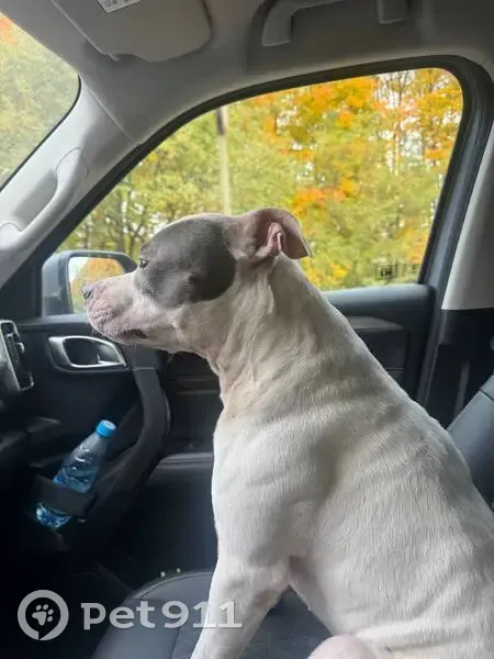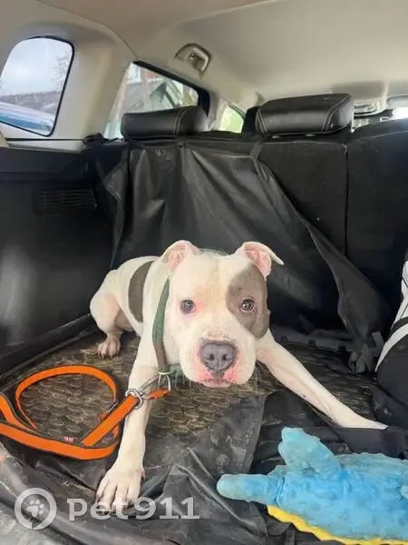 Найден кобель на шоссе недалеко от Мочилы муниципального округа Серебряные пруды, Московской области. Амстафф или питбуль. Ищем хозяина. Был без ошейника.
