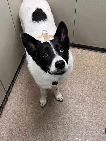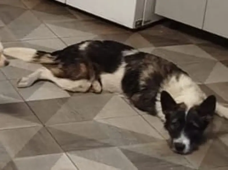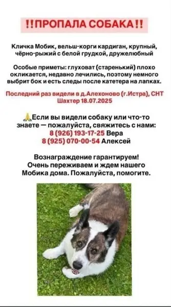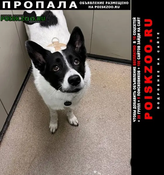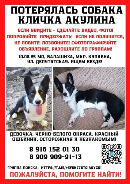 Коротконогая лопоухая молодая собака. С поводком-рулеткой, в простом кожаном и противоблошином ошейниках. Была привязана к кустам между СНТ Лесное и полем. Мы увидели в 13 часов, вернулись в 16 - её никто не забрал. Шел дождь с ночи, а трава под ней сухая. Пугливая, повела нас к станции "43 км". Очень стрессует, возможно, простужена. Хозяева, найдитесь!