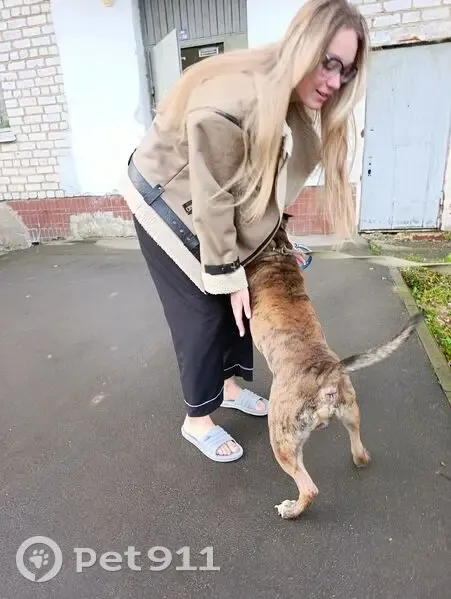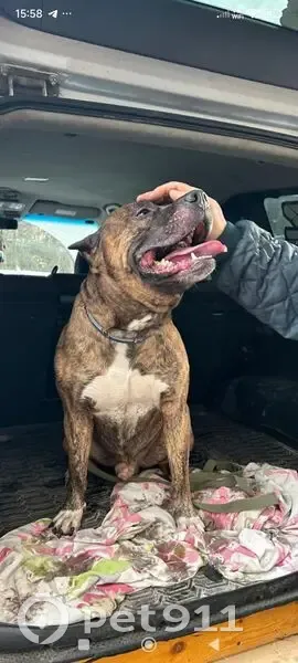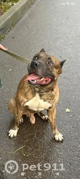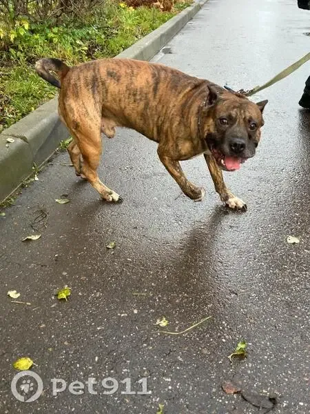 Стафф. Тигрового окраса , возраст от 2 до 3 лет, уши купированы, звост не купирован, белое пятно на груди в форме треугольника, белые кончики лап, не кастрирован, контактный.