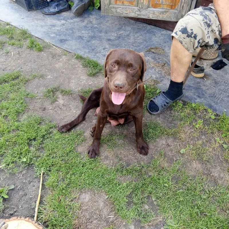 Найдена собака, похожа на лабрадора, недавно ощенилась. Прибилась сегодня утром. Из сообщений волонтера ее нашли на трассе около Спасска Рязанской области и привезли в Рязань.