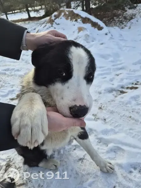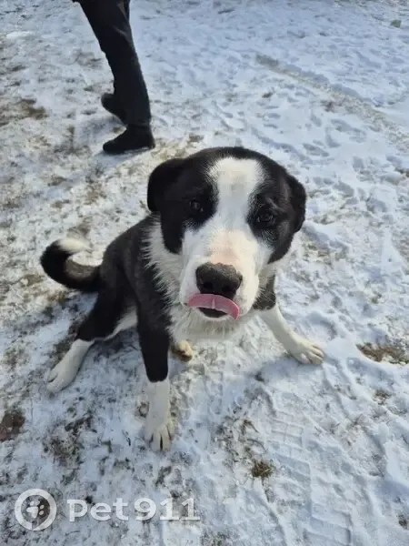 Черно-белый щенок Алабая(не точно), мальчик. Надет ошейник. Две недели бегает по поселку. Утром и вечером его видят у нас на улицах. Явно потерялся . Есть сведения что он из старых прудищ, но кто точно хозяин не известно