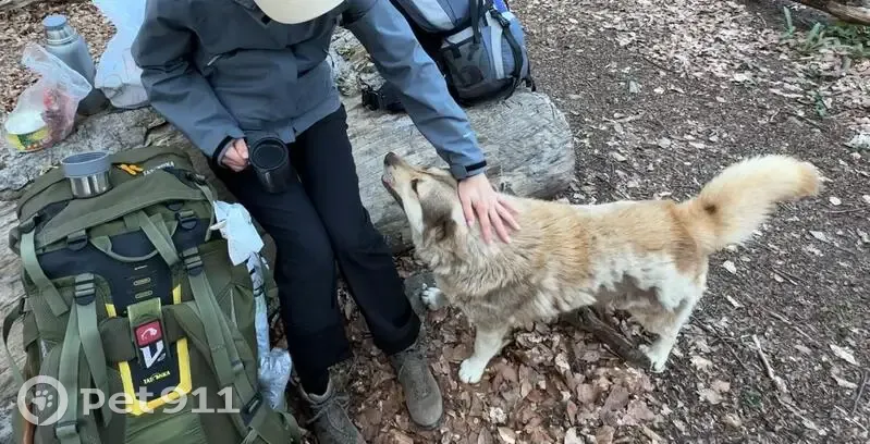 Пес прибился к туристической группе, шел за нами от Ангарского перевала до села Лучистое. Очень красивый, похож на лайку, кроме хвоста, хвостом похож на лису) пуганый, но идёт на контакт, дает гладиться. Персиковый окрас, густая шерсть, облезает.