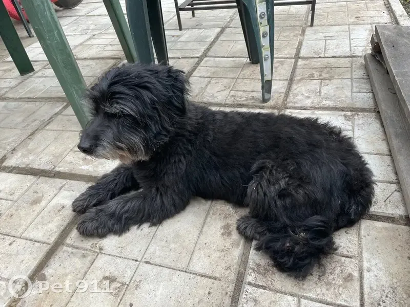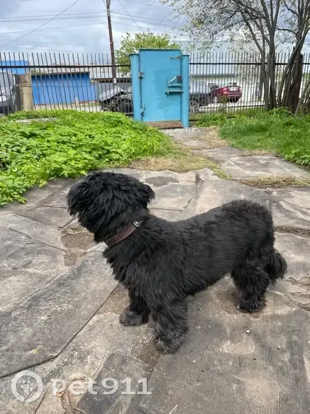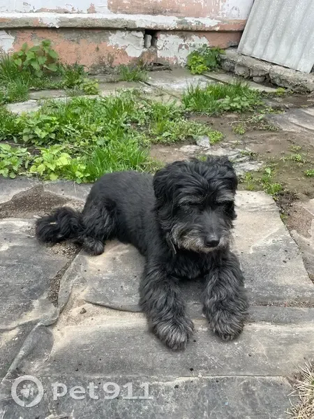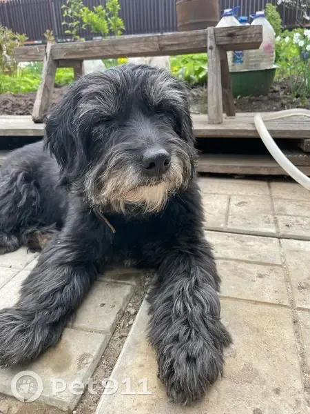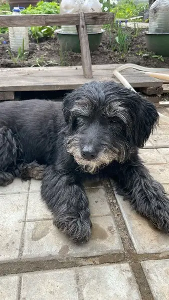 Окрас черный с сединой, похожа на стриженную болонку, хвост пострижен как у льва с кисточкой, очень спокойная, собака пожилая скорее всего, брови с сединой, сука