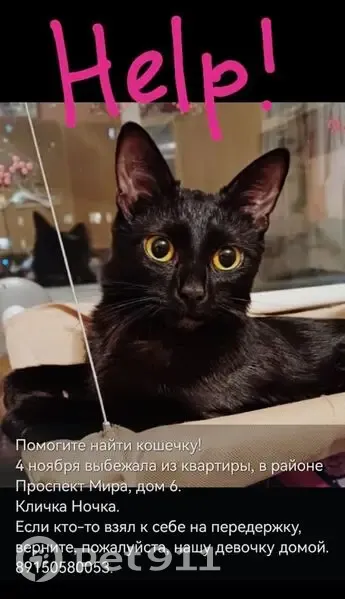 Выбежала из квартиры в подъезд, вероятно сильно напуганна, блестящая шерсть черного цвета, желтые выразительные глаза, стройная, короткошерстная кошечка.