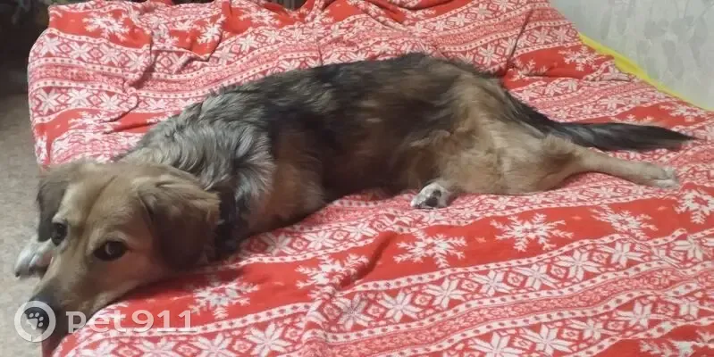 Окрас черный с коричневым, лапки и грудка - белые. Среднего размера, примерно 20 кг. Висячие ушки. Карие глаза, будто подведенные черным карандашом. Шерсть длинная. Ошейника на ней нет. Ласковая со знакомыми людьми и теми, кто к ней хорошо расположен, обычно очень любопытная, но пугливая. Вечером, примерно в 9, во время прогулки, кто-то начал пускать салюты, она жутко испугалась и пулей убежала в сторону соседних домов.